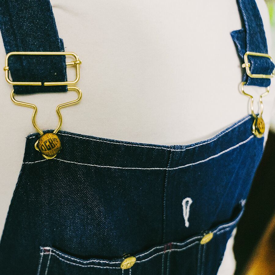 オーバーオールに使用されているエイジングリベットはDIYやタフな作業をイメージさせるエイジング加工を施しました。